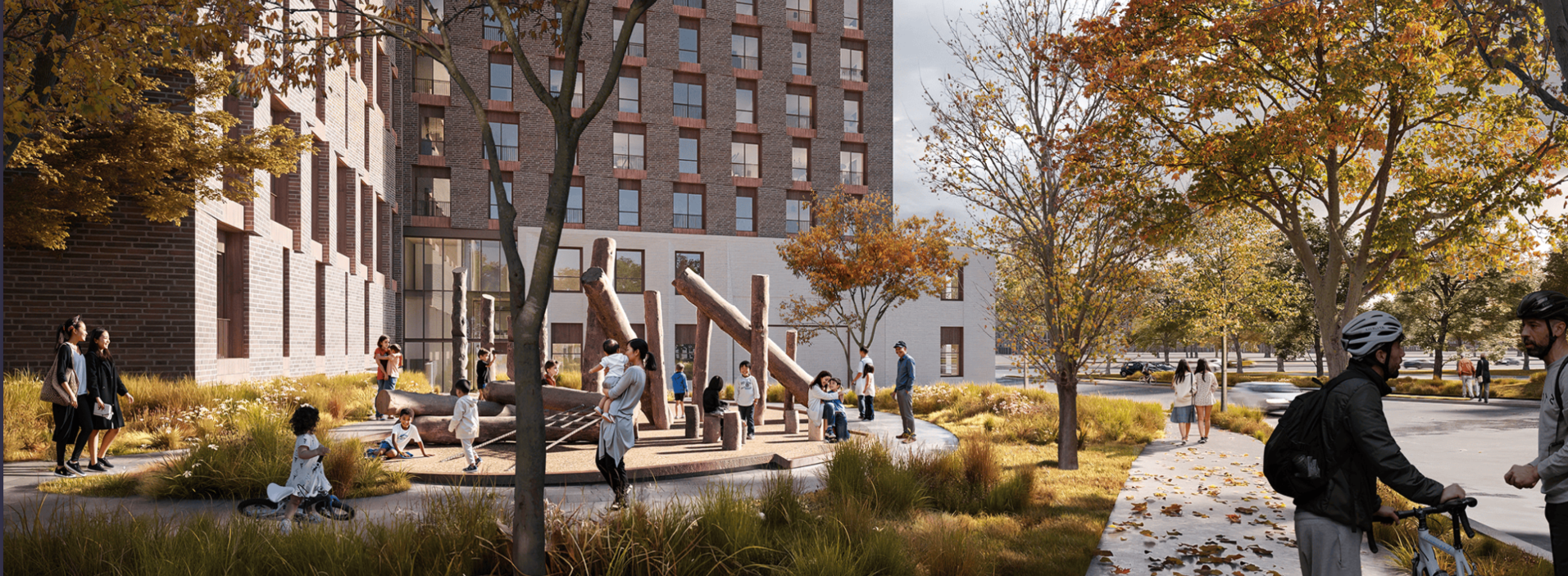 At the heart of the community is the 147 year old chapel built in 1876. This heritage structure is being preserved and converted into a public amenity maintaining its central presence on site. Kindred Works, a B Corporation with a focus on sustainability, incorporates natural climate safe materials, geothermal ready heating, an all electric HVAC system and electric vehicle ready parking. The project also features a landscaped courtyard with a natural material play space for children.